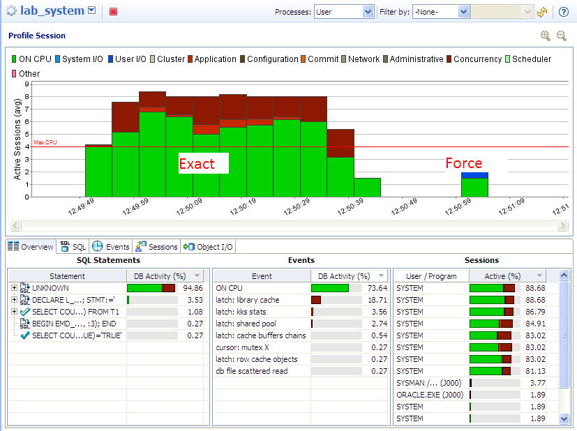 Anyone who has been around Oracle performance over the years knows the grief that hard parsing SQL queries can cause on highly concurrent applications. The number one reason for hard parsing has been applications that don’t use bind variables. Without bind variables queries that would otherwise be shared get recompiled because their text is different and Oracle treats them as different queries. Oracle addressed this issue with a parameter called cursor_sharing. The parameter cursor_sharing has three values exact – the default similar – replace literals with bind variables, if a histogram keep literal in place force – replace literals with bind variables and use existing plan if it exists Here is what the load looks like going from the default, exact, to the value force on a load of the same query but a query that doesn’t use bind variables: