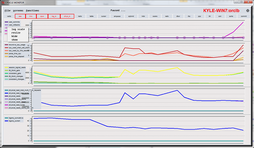 A different set of stats selected, in this case session (ses), transaction (trnx), CPU, log file I/O (log_io) and physical I/O (phys_io).